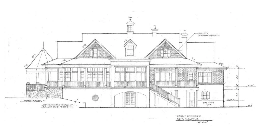 Lakefront Classical Shingle Style Symmetrical Shingle Style with sweeping wrap around porches. Front view: Rear view: