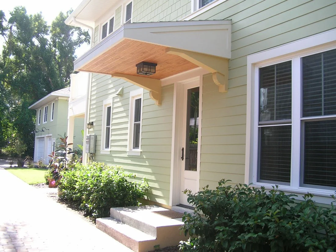 Custom brackets at the covered side entry stoop.